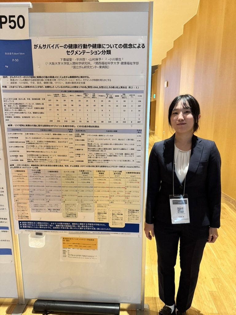 2025年10月10日-11日、沖縄県糸満市にて開催された第38回日本サイコネフロロジー学会に、平井啓先生と修士1年の下豊留愛が参加しました。「がんサバイバーの健康行動や健康についての信念によるセグメンテーション分類」という演題でポスター発表を行いました。なお、共同研究者に、関西福祉科学大学健康福祉学部健康科学科に所属されている山村麻予先生と、国立がん研究センター東病院に所属されている小川朝生先生がいらっしゃります。